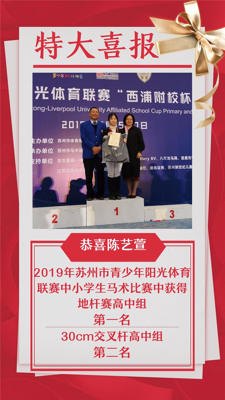 今天下午,2019年苏州市青少年阳光体育联赛首届中小学马术比赛在西交利物浦大学附属学校落下帷幕。本场比赛吸引了9个参赛队伍,共67名运动员,237对人马组合。课程中心陈艺萱同学也参与其中,并脱颖而出,一举拿下地杆赛高中组第一名及30cm交叉赶赛高中组第二名的好成绩。